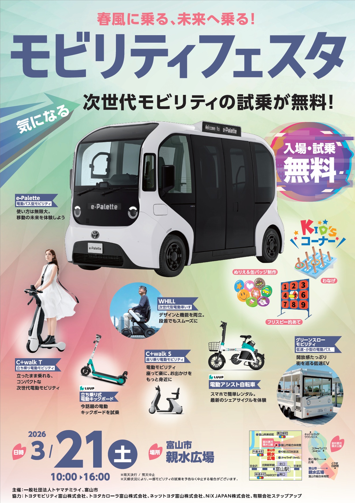 新しくなった親水広場に「次世代モビリティ」が大集合! e-PaletteやC-walkなど無料で試乗できます。 キッズコーナーでは輪投げ・フ …